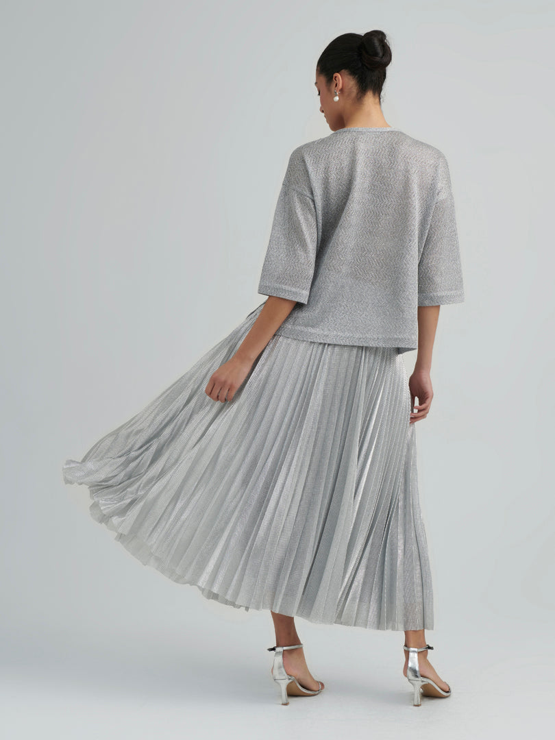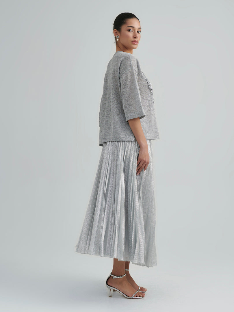 The ARIA SKIRT embodies effortless elegance with its fluid pleated structure and luminous textured finish. Designed to move gracefully with every step, the airy silhouette creates a refined sense of lightness while maintaining a polished, modern aesthetic. The delicate shimmer of the fabric enhances its sophisticated appeal, making it an ideal piece for elevated daywear or elegant evening styling.